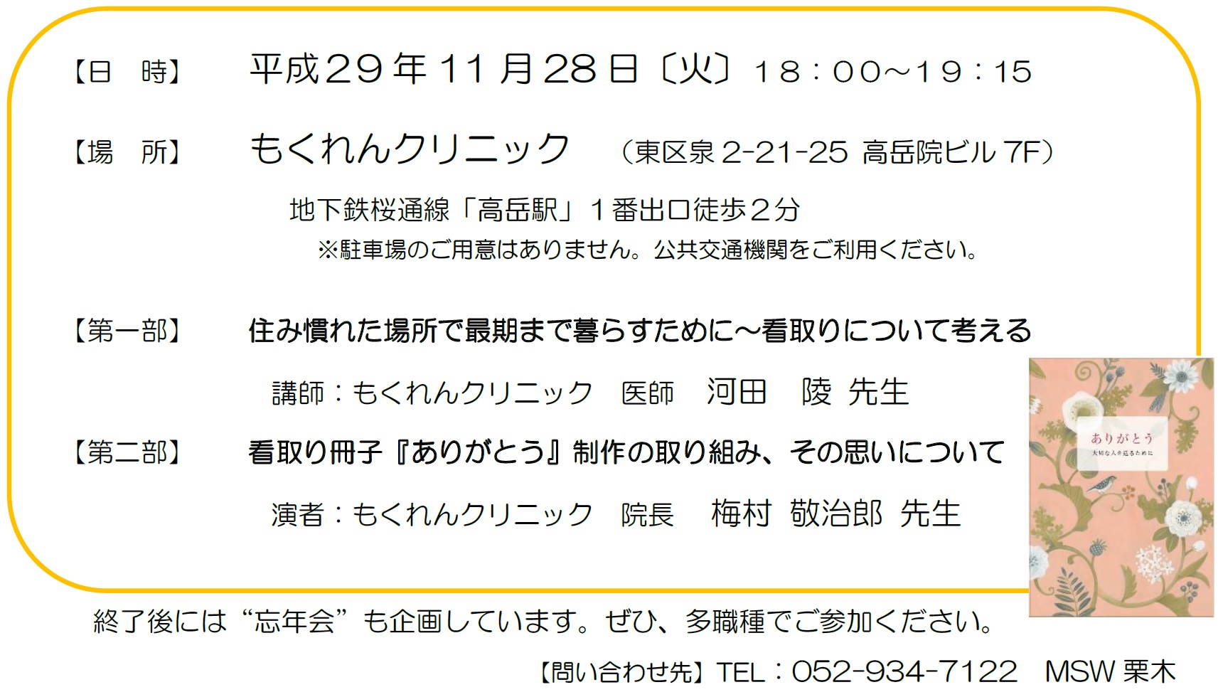 第二部は、本年の締めくくりとして、当クリニックで制作した看取り冊子『ありがとう』について触れ、制作の取り組みや冊子に込めた思いを梅村敬治郎院長よりお話しさせて頂きます。