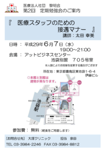 第2回 医療法人社団黎明会 定期勉強会を開催します。 今回のテーマは『医療スタッフのための接遇マナー』です。 今回は「太田幸美 様」をお招きし、 医療スタッフのための接遇マナーについてお話しいただきます。