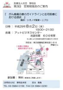 第3回 医療法人社団黎明会 定期勉強会を開催します。 今回のテーマは『がん疼痛治療のガイドラインと在宅医療における現状』です。 今回は「シオノギ製薬・ニプロ 様」をお招きし、 がん疼痛治療のガイドラインと在宅医療における現状についてお話しいただきます。
