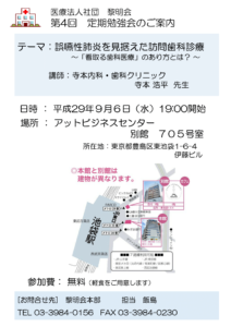 第4回 医療法人社団黎明会 定期勉強会を開催します。 今回のテーマは『誤嚥性肺炎を見据えた訪問歯科診療~「看取る歯科医療」のあり方とは? ~』です。 今回は「寺本内科・歯科クリニック 寺本 浩平先生」をお招きし、 誤嚥性肺炎を見据えた訪問歯科診療についてお話しいただきます。