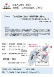 第5回 医療法人社団黎明会 定期勉強会を開催します。 今回のテーマは『「在宅医療で役立つ経腸栄養の基本」 ~PEG管理の工夫や栄養剤の違いをふまえて~』です。 今回は「大塚製薬工場 様」をお招きし、 在宅医療で役立つ経腸栄養の基本についてお話しいただきます。