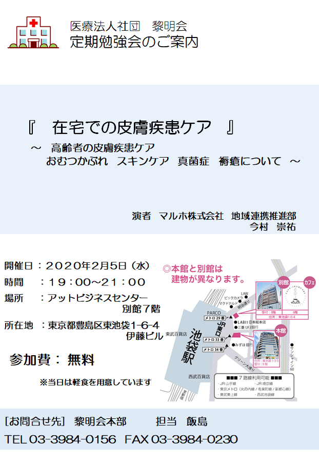 第20回 医療法人社団黎明会 定期勉強会を開催します。 今回のテーマは『在宅での皮膚疾患ケア』です。 今回はマルホ株式会社 地域連携推進部「今村 崇祐」様をお招きし、お話いただきます。