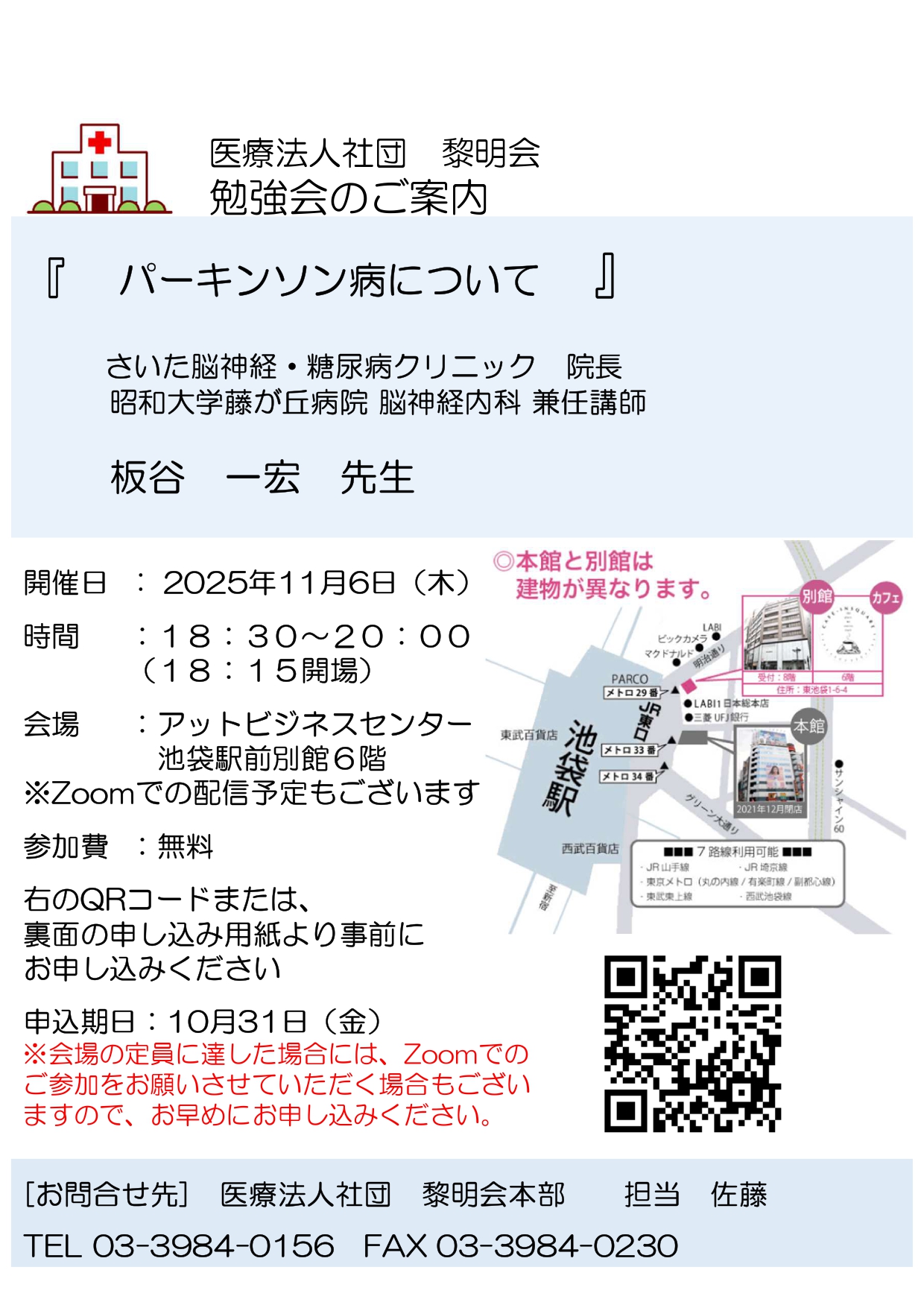 2025年11月 医療法人社団黎明会 勉強会を開催いたします。 今回のテーマは『パーキンソン病について』です。